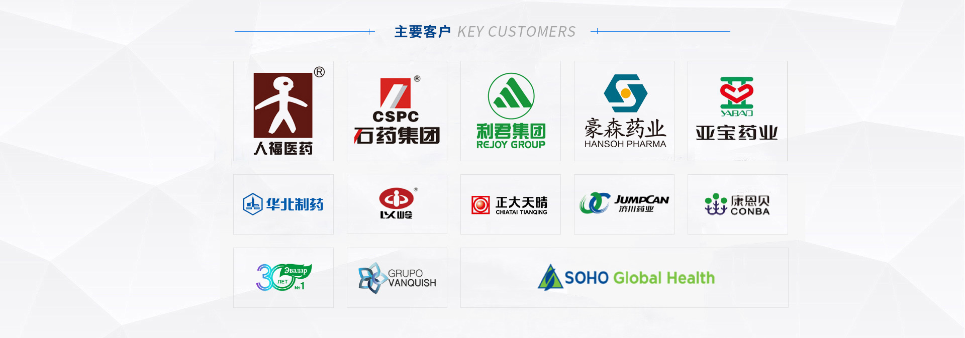 我們的客戶(hù):華藥集團(tuán) | 石藥集團(tuán) | 九州藥業(yè) | 以嶺藥業(yè) | 正大天晴 |武漢人福 | 西安利君 | 山西亞寶 | 濟(jì)川藥業(yè) | 中山達(dá)安基因 | 恒升醫(yī)學(xué) | 九州通 | 康恩貝 |四環(huán)藥業(yè) |豪森藥業(yè) | 哈藥集團(tuán) | 東北制藥 | 武漢麥鑫利